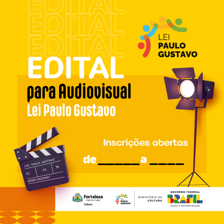 A Secretaria Municipal da Cultura de Fortaleza – SECULTFOR, através do Fundo Municipal de Cultura, torna público o processo de inscrição do Edital Audiovisual 2023, com base no art 6º da Lei Complementar nº 195/2022 (Lei Paulo Gustavo), no Decreto nº 11.525/2023 (Decreto Paulo Gustavo), Decreto nº 11.453/2023 (Decreto de Fomento), no Decreto nº 15.734/2023 (Decreto de Regulamentação da Lei Paulo Gustavo do Município de Fortaleza), e na Lei nº 8.666/93 no que couber.